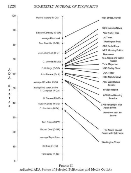 ASIDE: The data are averages for the period 1993 to 2002. The scores for NPR, the Wall Street Journal, and Drudge Report, which might be surprising to some, are explained in the paper. Briefly, NPR and Drudge Report are more balanced than many people think, and the Wall Street Journal’s news is an entirely separate operation from its famous editorial page.