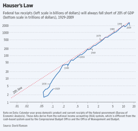 May 27, 2010If the definition of a gaffe is when a politician tells the truth, Paul Volcker committed a major gaffe in a recent speech. Volcker (one of President Obama’s chief economic advisers) cited Hauser’s law and compared it to the current rate of federal spending. He noted that the federal government always collects about 18.5% of GDP in tax revenue regardless of tax rates. When spending was around 20%, this meant a modest deficit, but spending is now around 25% or more. That means enormous deficits.